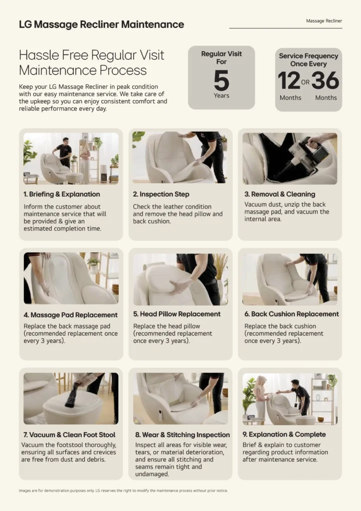 Nikmati pengalaman LG tanpa risau dengan LG CareShip. Program penjagaan profesional berjadual memastikan produk LG anda sentiasa beroperasi pada tahap terbaik melalui servis berkala, pembersihan menyeluruh dan sanitasi pakar untuk rumah yang lebih sihat.
